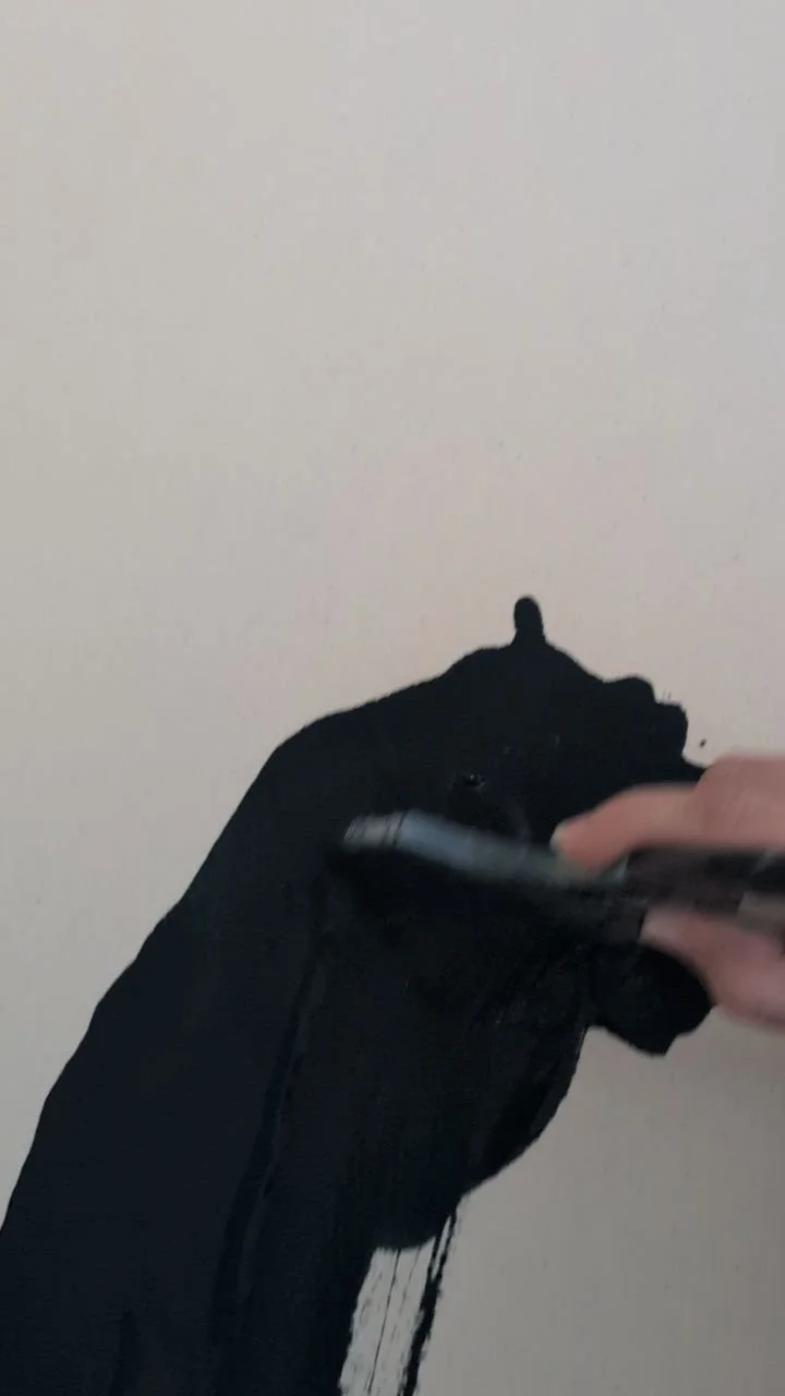 A person with dark hair wearing a white shirt and blue jeans holding a framed abstract painting, with similar paintings leaning against the wall.