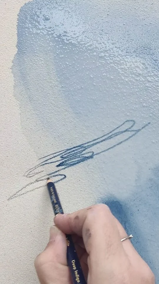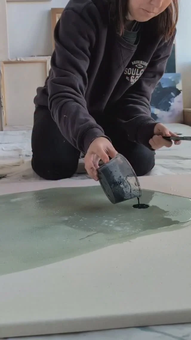 Abstract watercolor painting with shades of green, blue, black, and white in various textures and brushstrokes.